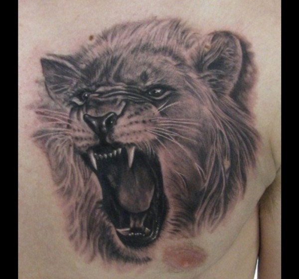 男性左胸部愤怒的的雄狮纹身图片