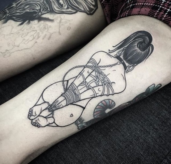 女生后腰纹身黑白灰风格抽象线条纹身图案