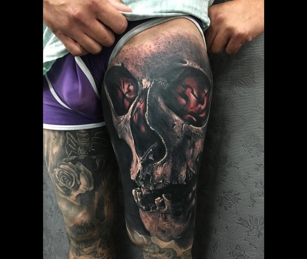 男性左右花腿恐怖的大骷髅头纹身图片
