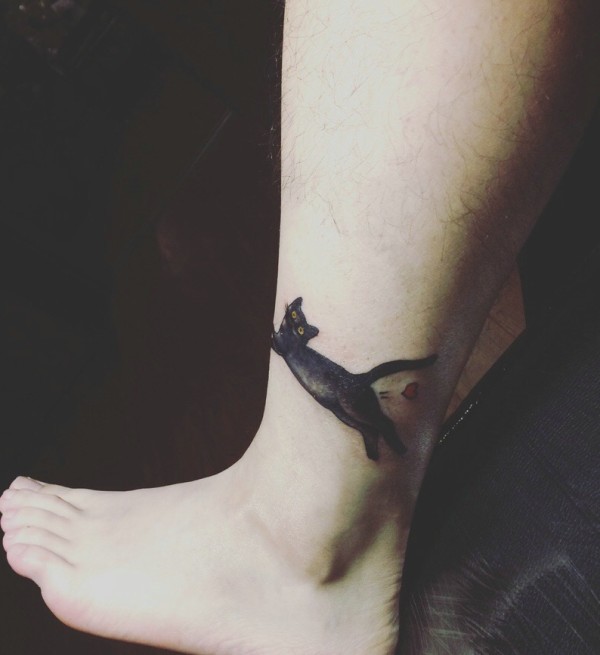 自家有的一条黑猫腿部纹身图案