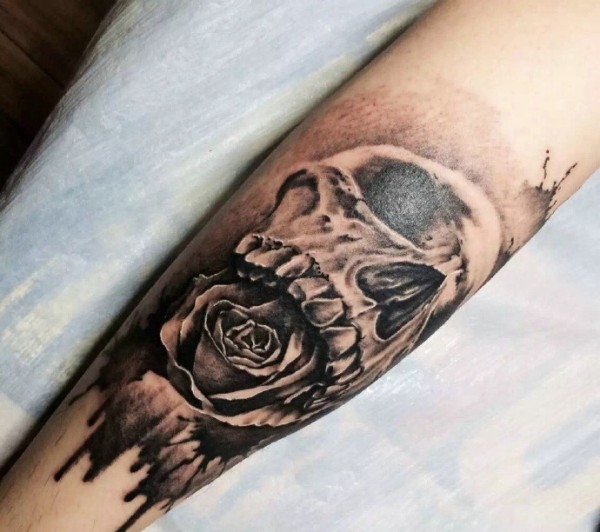 黑灰色玫瑰花和骷髅头纹身图片手稿