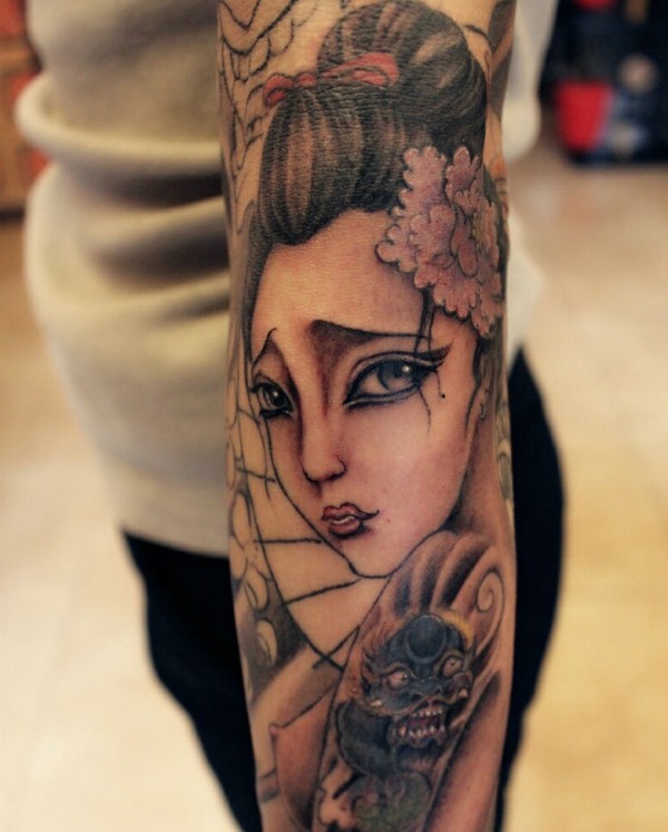花臂彩色古代花妓纹身图案很精美