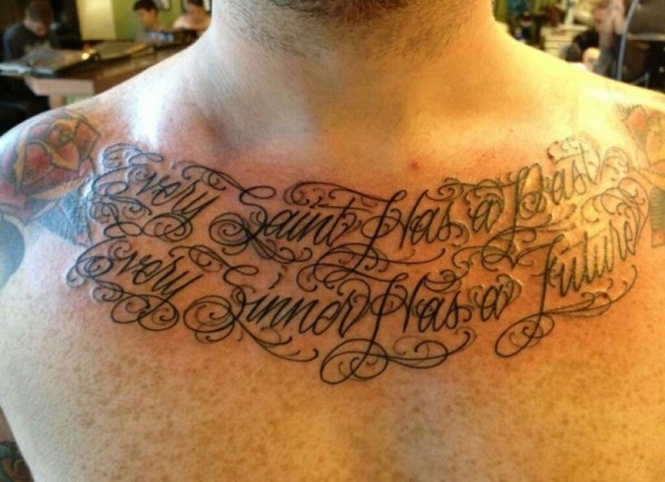 男性满胸霸气的刻字风格纹身图案