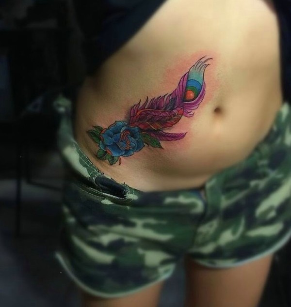 遮盖辣妈腹部边上的彩色花朵纹身图案