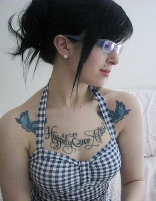 漂亮女子满胸鸟儿和英文字纹身图片