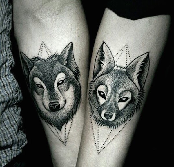 情侣手小臂上的虚线和帅气的狼纹身图片