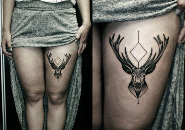女性左大腿上性感的几何图形鹿头纹身图