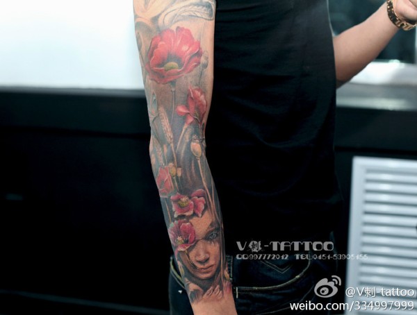 男人大臂黑白彼岸花骷髅_黑白纹身图案大全_纹身图吧