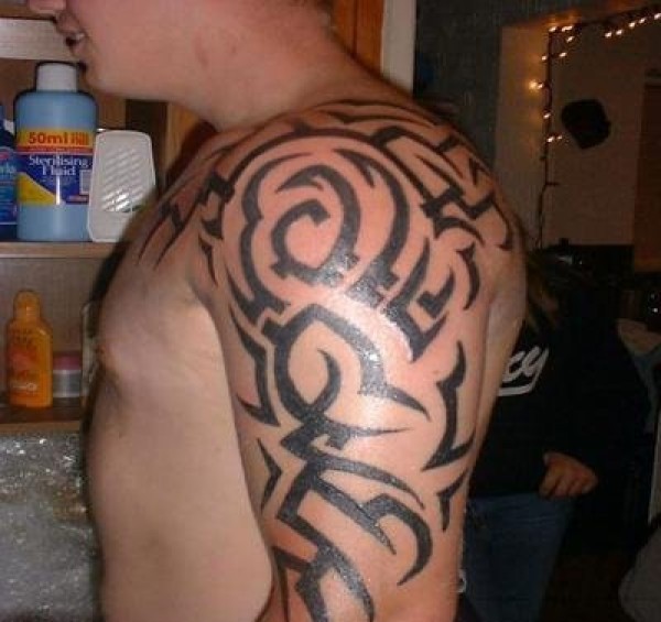 男性左手大臂膀至肩膀上帅气的黑色部落图腾纹身图片