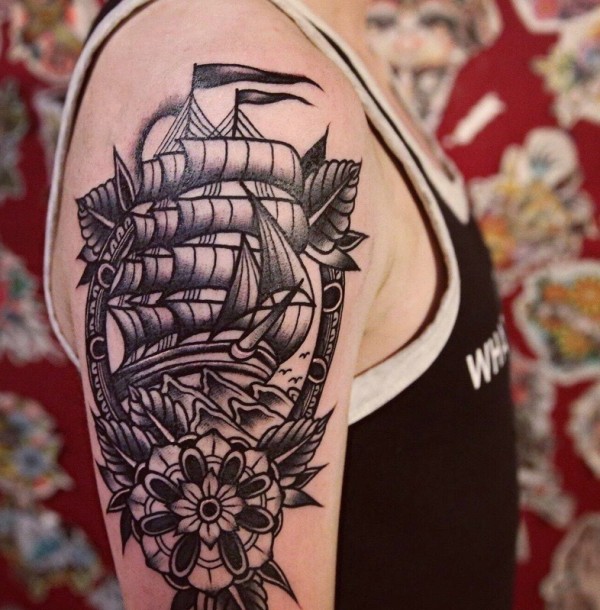 花篮与帆船混合的手臂纹身图案