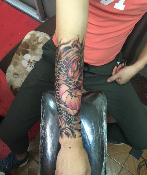 活蹦乱跳的手臂彩色鲤鱼纹身图案