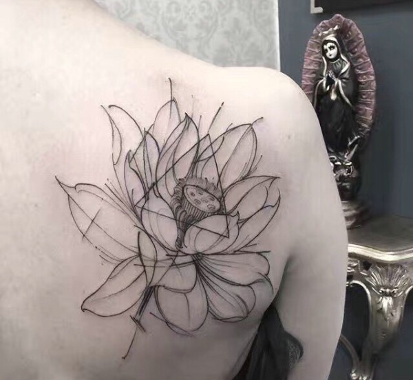 线条几何荷花后背纹身图案