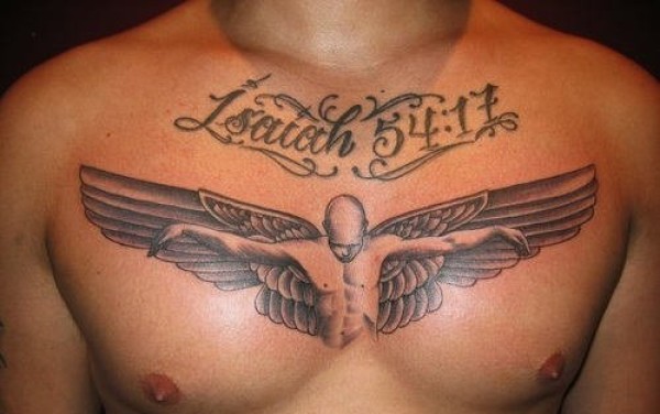 男子满胸帅气文字和天使纹身图片
