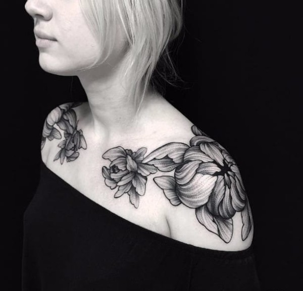 女性肩膀上多款漂亮的花朵纹身图案