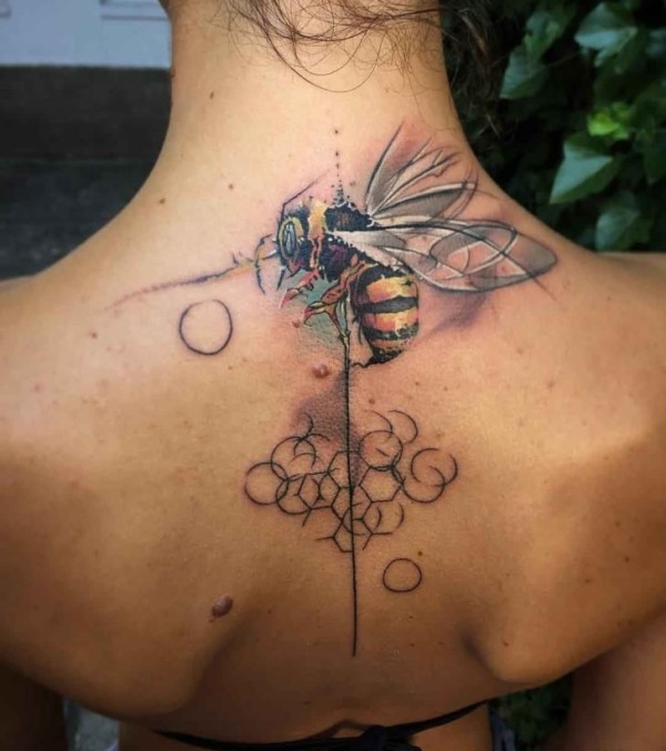 女子背部脊椎骨上的线条和蜜蜂纹身图片