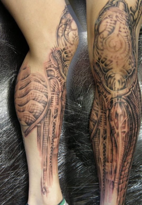 帅气的机械生物花小腿纹身图案