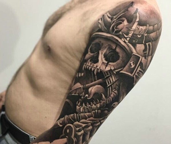 一款个性花臂黑灰骷髅纹身图案