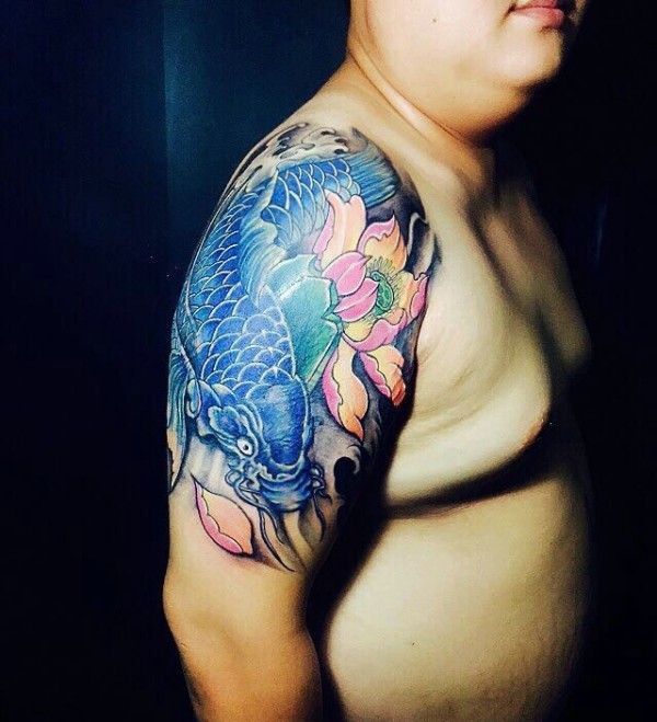 莲花与蓝鲤鱼结合的大臂纹身图案