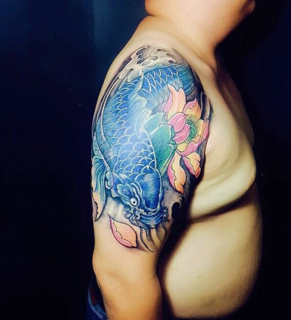莲花与蓝鲤鱼结合的大臂纹身图案