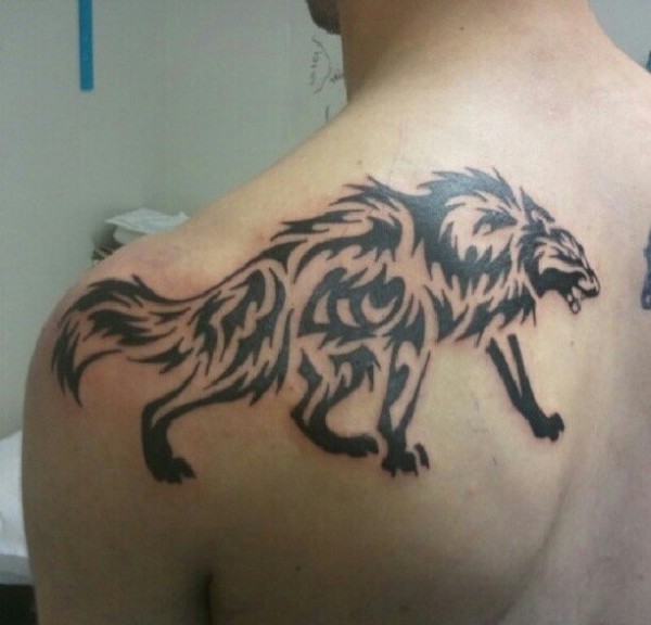 男子左后肩背上凶猛的黑色狼图腾纹身图片