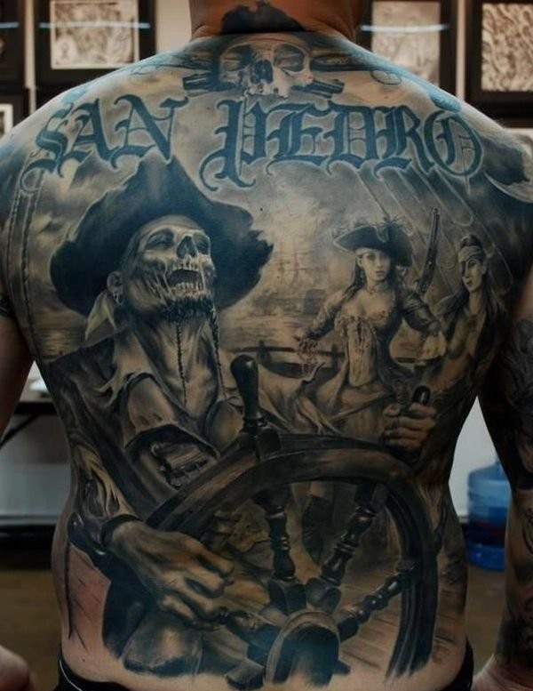 花臂男子满背刻字骷髅海盗纹身图片