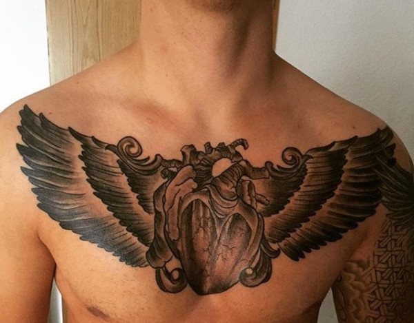 男子满胸帅气的翅膀真实心纹身图片