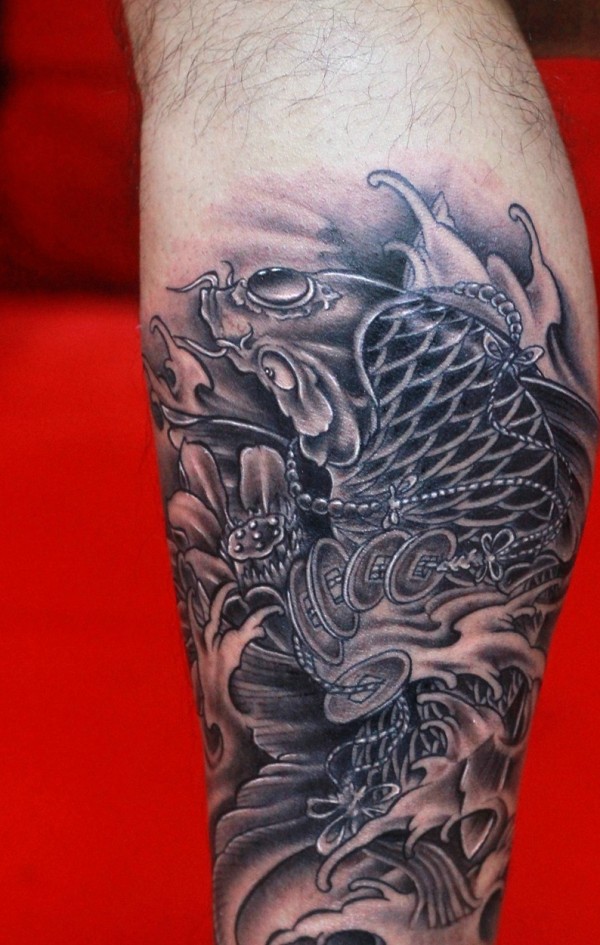 传统鲤鱼花小腿纹身_腿部纹身图案大全_纹身图吧