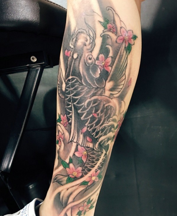 传统鲤鱼花小腿纹身_腿部纹身图案大全_纹身图吧