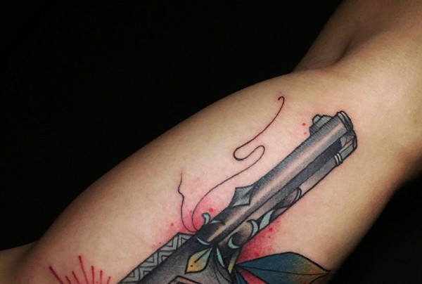 手臂一只彩色水枪纹身图案酷酷的