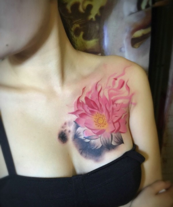 女生胸前彩色荷花纹身图案
