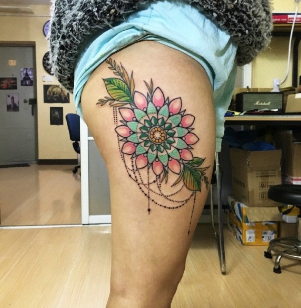 大腿外侧抢眼的美丽花朵纹身图案