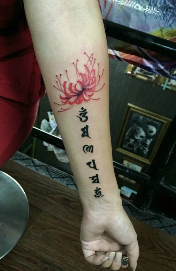 彼岸花与梵文结合的手臂纹身图案