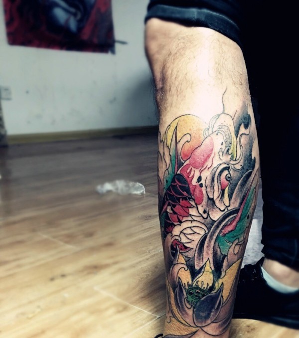 传统鲤鱼花小腿纹身_腿部纹身图案大全_纹身图吧