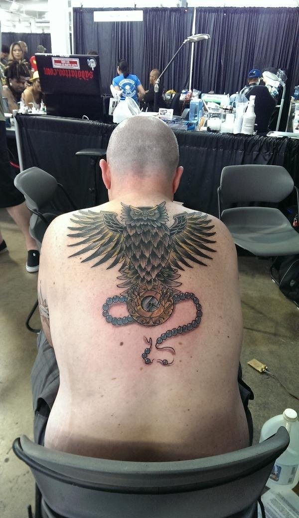 男子背上漂亮的吊坠和猫头鹰纹身图片
