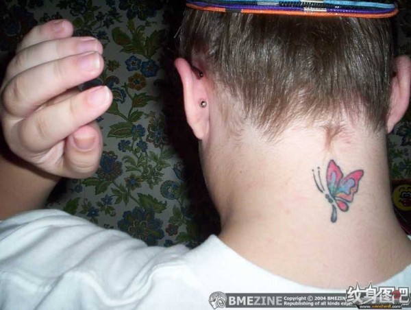 后颈处的红色蝴蝶纹身