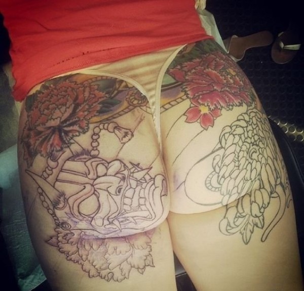 女子性感屁股上漂亮的花卉和般若纹身图片