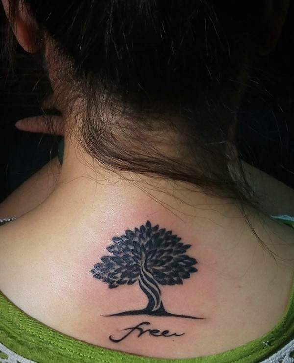 脖子后部一颗精致的小树纹身图案