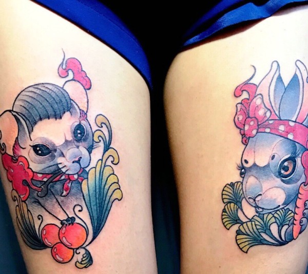 双腿部彩色卡通小动物纹身图案