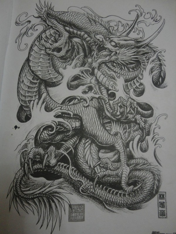 龙纹身手稿_一组老传统黑灰龙手稿纹身图案