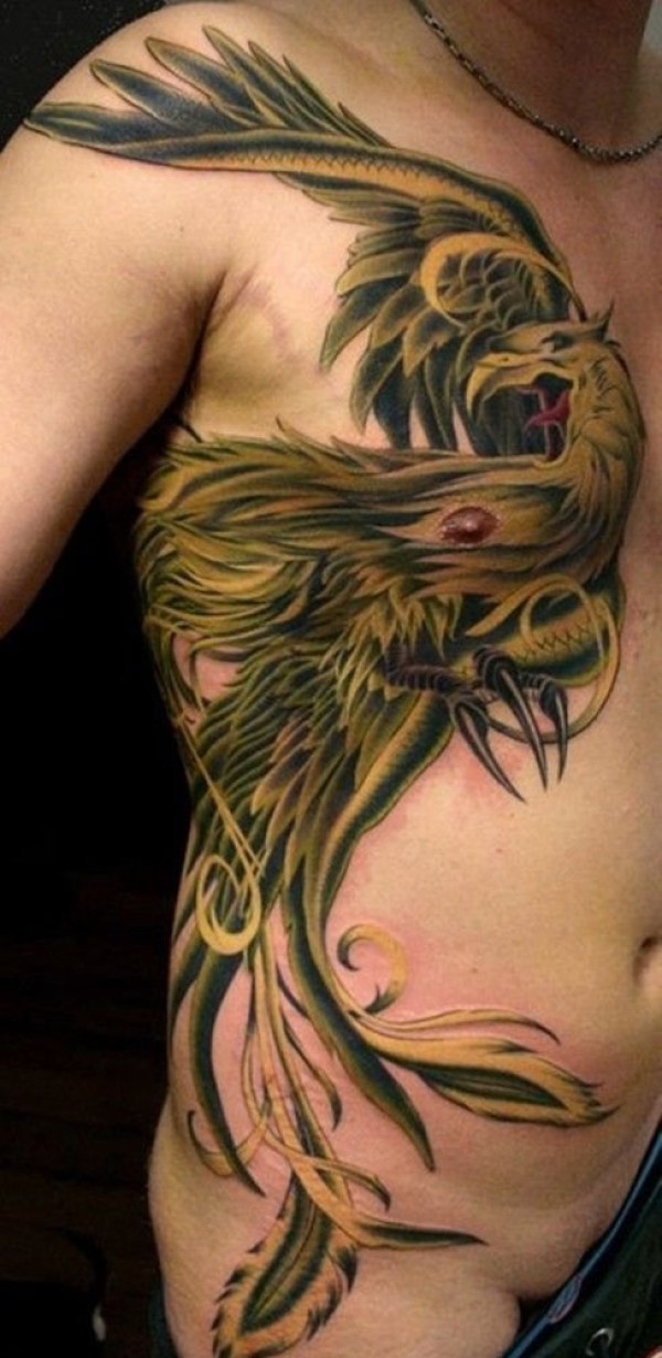 男子侧身帅气的金黄色凤凰纹身图片