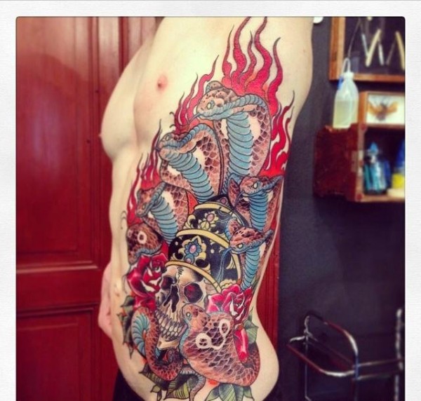 男子侧肋漂亮的彩色多头蛇和骷髅纹身图片