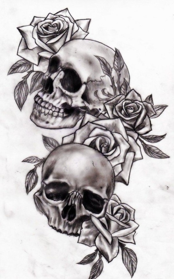 黑灰色玫瑰花和骷髅头纹身图片手稿