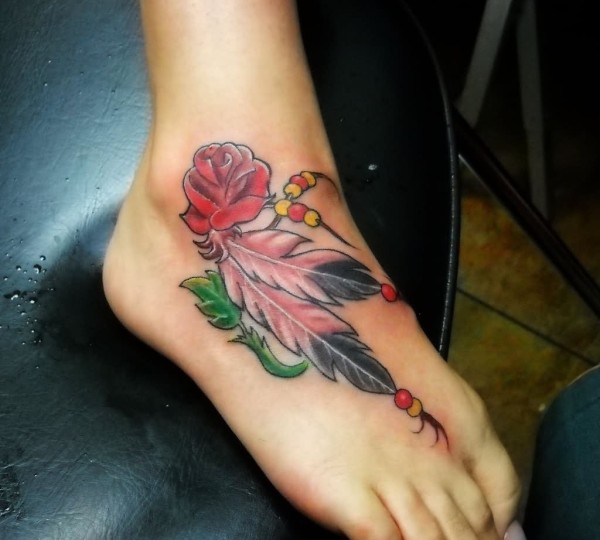 脚背上漂亮的红花朵和羽毛纹身图片