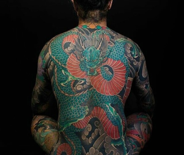 一组日式风格的满背彩色纹身图案