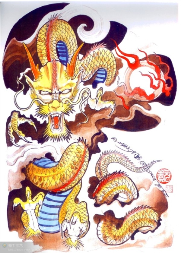龙纹身手稿_一组老传统黑灰龙手稿纹身图案