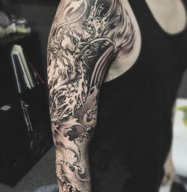大臂黑灰邪龙纹身