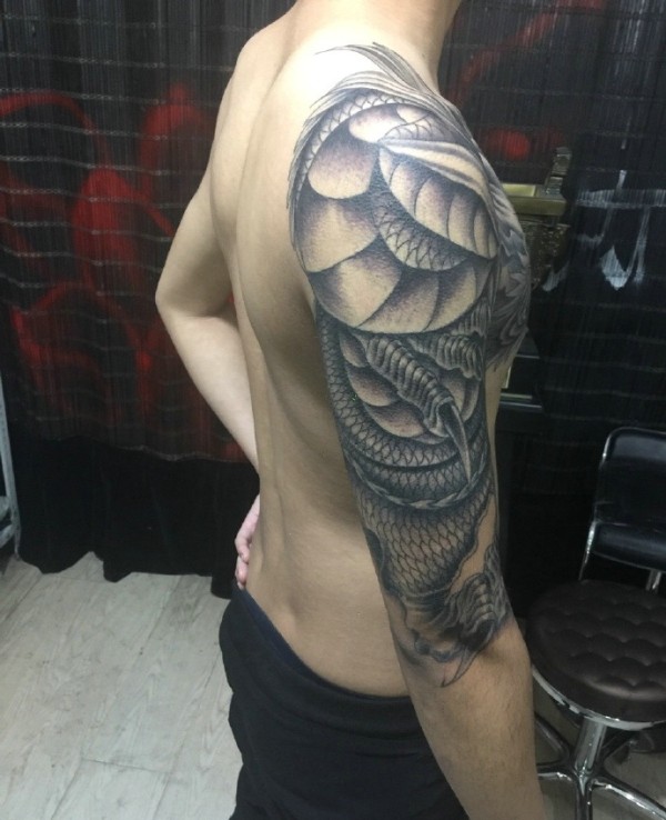 日式手彫刺青作品—半甲龙很感谢客户认可手彫刺青,手彫是日本纹身的手工雕刻技术,时间可以追溯到日本17世纪的江户时代。19世纪,手彫技术被日本黑帮挪用,被用作入会仪式,象征着从此就是江湖中人。在日式传统