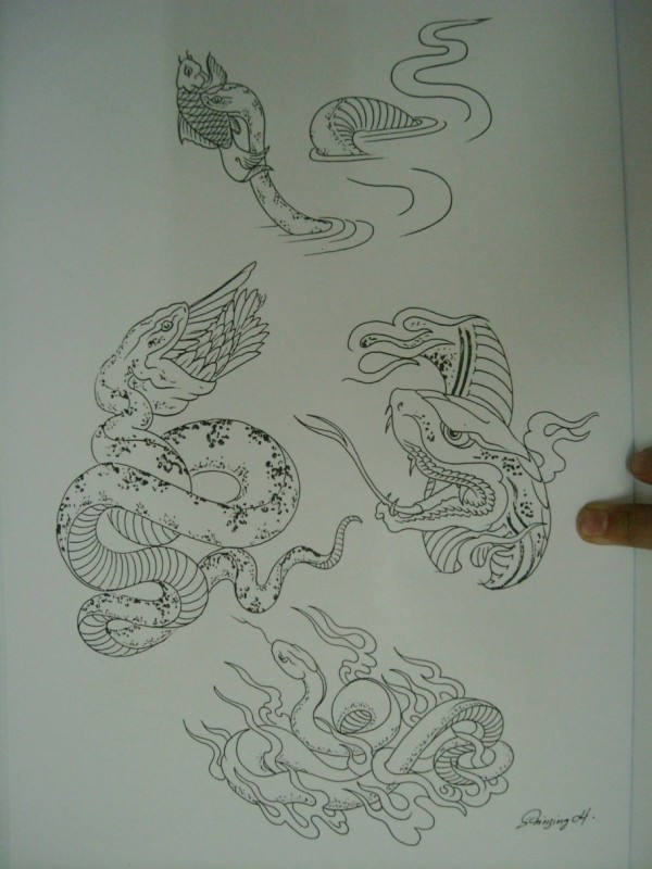 龙纹身手稿_一组老传统黑灰龙手稿纹身图案