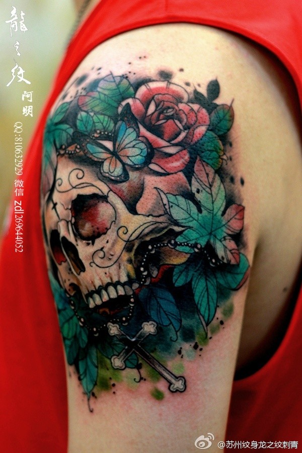 女生手臂经典潮流的骷髅与玫瑰花纹身图案