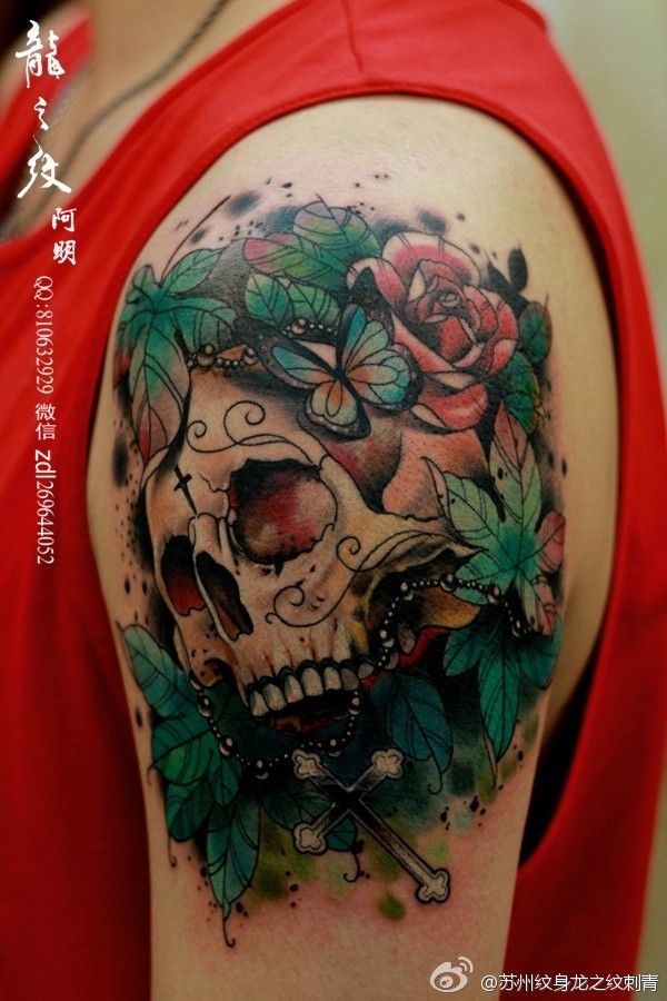 女生手臂经典潮流的骷髅与玫瑰花纹身图案